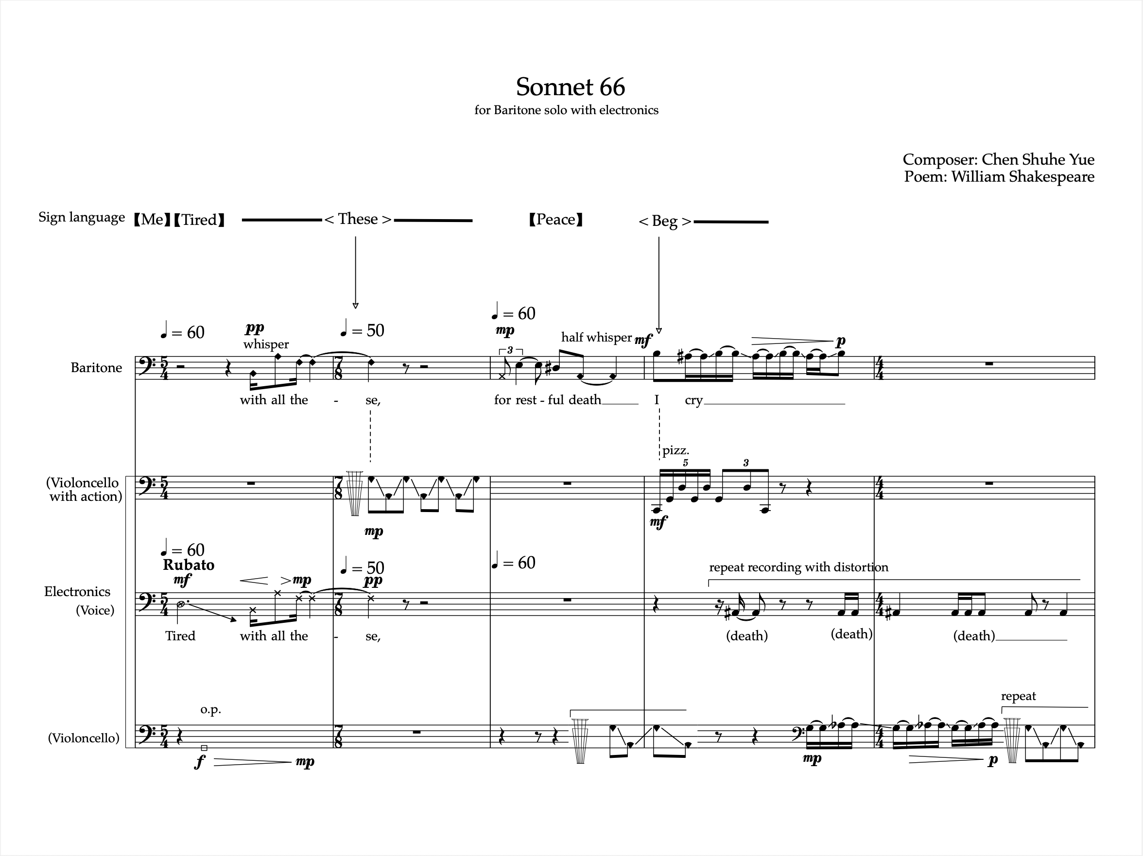 The signing must align precisely with the indicated vocal part, and in the section that occurs with the “Violoncello with actions,” the gestures should be repeated according to the rhythmic structure of the sound materials.